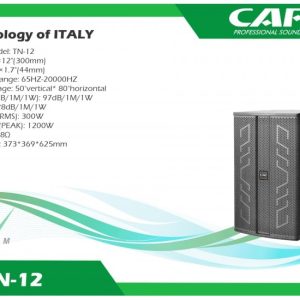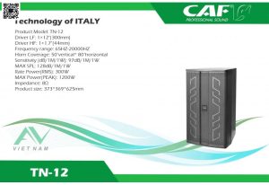 Loa CAF TN-12 là dòng loa full-range 2 đường tiếng cao cấp thuộc series loa chuyên dụng cho karaoke, hội trường và sân khấu chuyên nghiệp. Sản phẩm được sản xuất theo công nghệ Italy hiện đại, mang đến chất âm sống động, thiết kế sang trọng và hiệu năng vượt trội trong tầm giá.