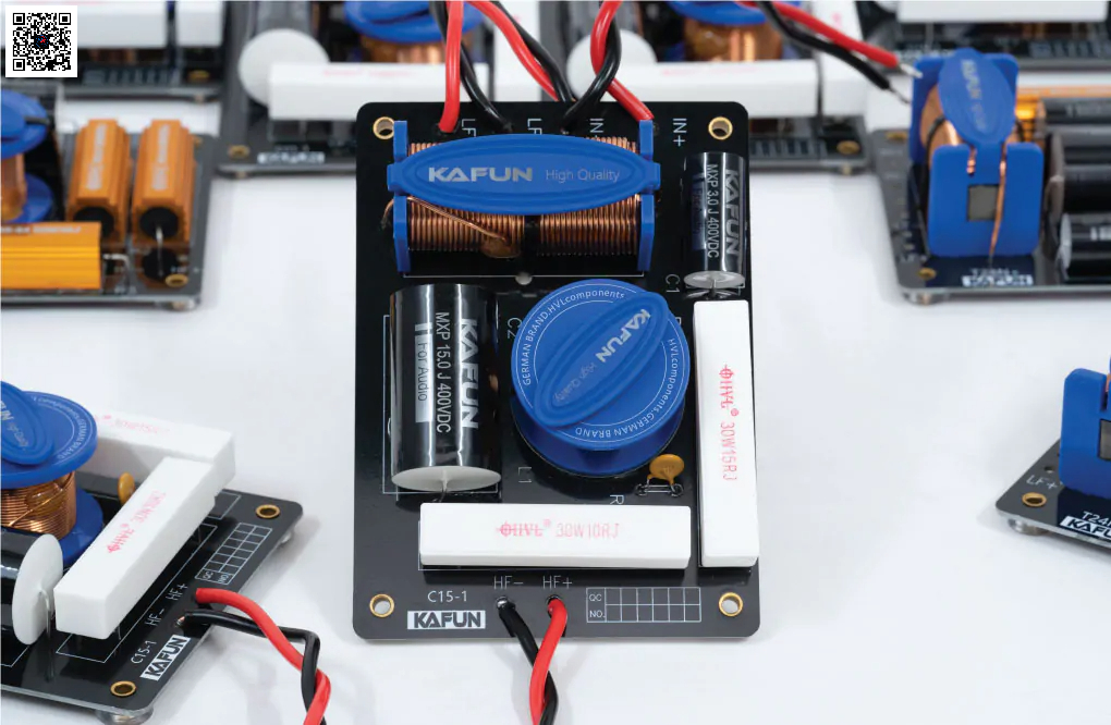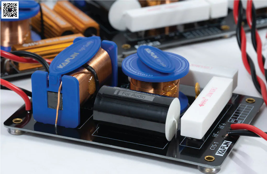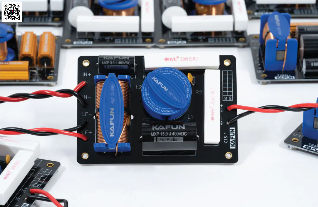 Phân tần KAFUN C15-1 sử dụng tụ MKP 400V chuyên dụng cho audio, giúp truyền tín hiệu âm thanh ổn định và sạch.